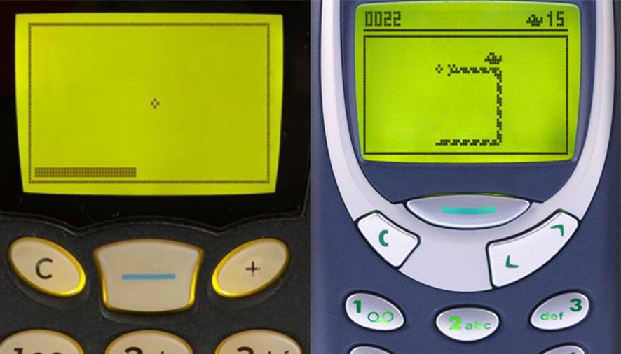 O jogo de cobrinha do celular tijolão da Nokia consistia num amontoado de pixels organizado em linha reta, simulando uma cobra, que se movimentava sem parar sobre um fundo verde amarelado. Aleatoriamente, aparecia um ponto, uma comidinha, em algum canto da tela. O objetivo era direcionar o réptil através dos botões 2 [cima], 6 [direita], 8 [baixo] e 4 [esquerda] à comidinha. Quanto mais se alimentava, maior ele ia ficando, o que aumentava o grau de dificuldade do jogo, porque o bicho não podia esbarrar na moldura da tela nem em seu próprio corpo, se não morria. Era divertidíssimo passar horas jogando isso nos momentos de tédio, naqueles horários em que o pulso do telefone/da internet era mais caro e não podíamos nos conectar.